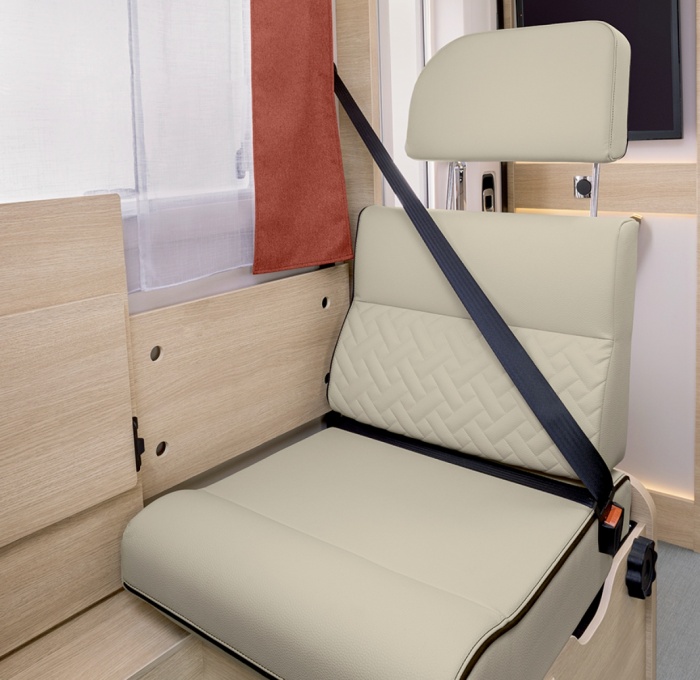 Bei der Innenausstattung wählen Sie die Atmosphäre, die zu Ihrem Stil passt: LUCEO oder NACARAT. Bei den Polsterungen stehen PALMA und NOUMEA* zur Auswahl. Die Jubiläumsmodelle 666F und 696F anlässlich des 65-jährigen Bestehens von RAPIDO verfügen über eine exklusive, bestickte Polsterung mit dem Logo «65 Jahre» (PALMA und NOUMEA).