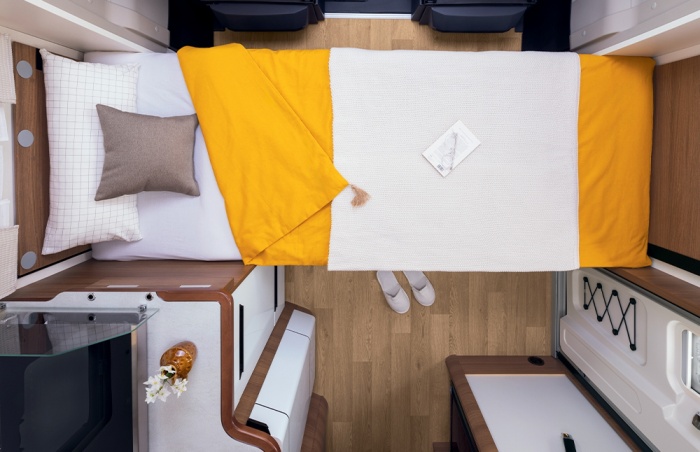 Sie wünschen sich noch mehr Platz und eine zusätzliche Schlafmöglichkeit? Dann wählen Sie die vollintegrierte Version unserer kompakten Modelle und profitieren Sie von einem komfortablen Hubbett im vorderen Bereich – für Reisen zu zweit oder zu viert, immer mit höchstem Komfort.